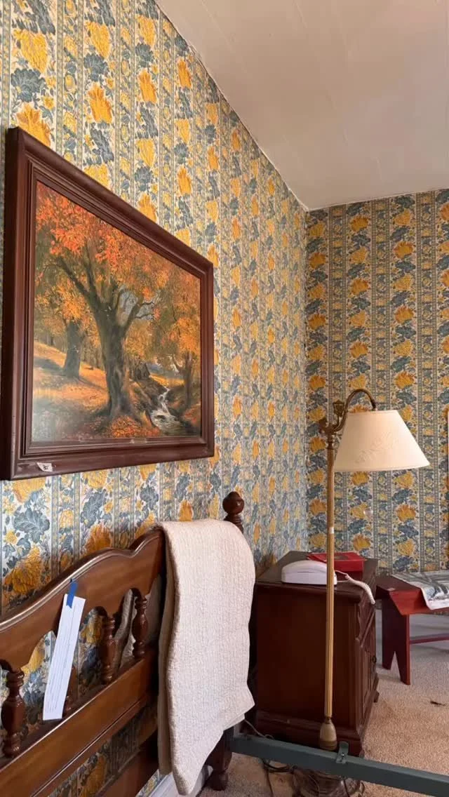 Tiny landscape scene with soul. This miniature dish features a charming pastoral motif: a cottage with an orange-red roof nestled among stylized trees, with delicate brushwork depicting a pond, grasses, and rolling clouds. Hand-painted details with fine black linework and soft watercolor washes in blues, greens, and yellows. Gold rim accent.